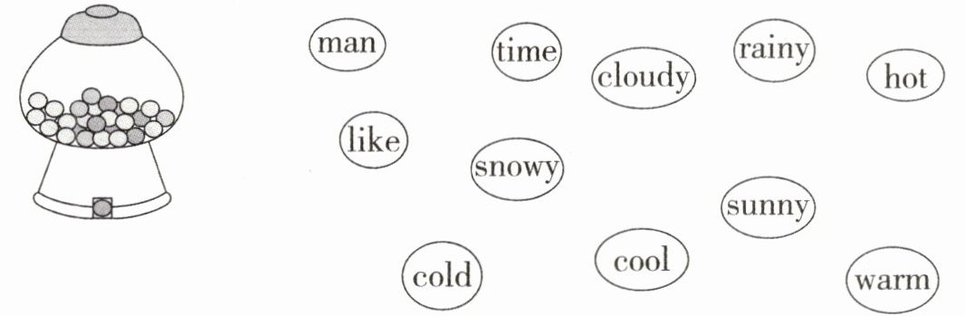 一、开心扭蛋机。预习课本,请在表示天气的单词小球上涂上你喜欢的颜色。