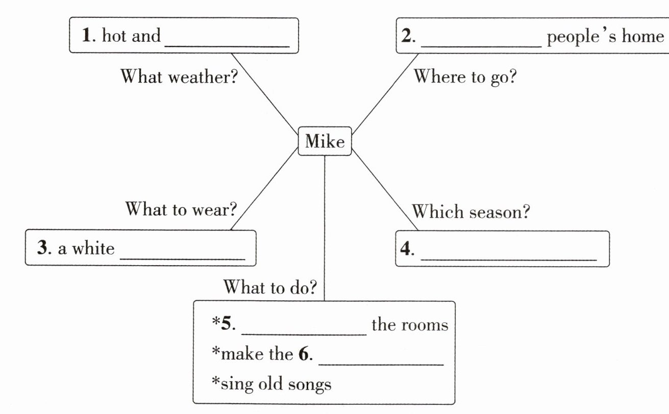 1. sunny 解析:根据方框内右上角的"Sunny and hot"可知,今天是大晴天,并且很热。2. old 解析:根据"Today I go to the old people's home with my friend Amy."可知,Mike 去了敬老院。3. T-shirt 解析:根据"I wear my new white T-shirt..."可知,Mike 穿了一件白色的 T 恤衫。4. spring 解析:根据"It's spring now ..."可知,现在是春天。5. clean 解析:根据"I clean their rooms and make the beds."可知,Mike 打扫老人的房间。6. beds 解析:根据"I clean their rooms and make the beds."可知,Mike 给老人铺床。