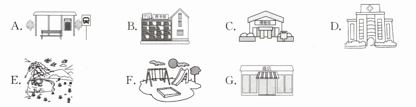 (一)CEFG 解析: 根据文中“There is a park.”“There is a big playground.”“There is a nice museum.”和“There is a shop too.”可知 Mike 的社区里有公园、游乐场、博物馆和商店。故圈 C、E、F、G。(二)go take see old do sports shopping a walk things Tim √ Tim's brother √ Tim's sister √ Tim's mum √ 解析: go shopping 购物;take a walk 散步;see old things 看老物件;do sports 做运动。根据文中“I'm Tim ... I can take a walk ...”“My brother ... does sports there.”“It's my sister's ... see many old things there.”和“My mum always buys food and fruit there.”可知 Tim 对应的是散步,Tim 的弟弟对应的是做运动,Tim 的姐姐对应的是看老物件,Tim 的妈妈对应的是购物。(三)My favourite place is the library. I often read books there.(此答案不唯一)解析: 题干意为“在你的社区你最喜欢的地方是哪里?你通常在那儿做什么?”,此题为开放题,答案不唯一。