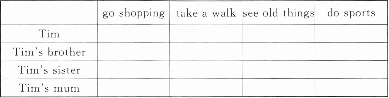 | |go shopping|take a walk|see old things|do sports|