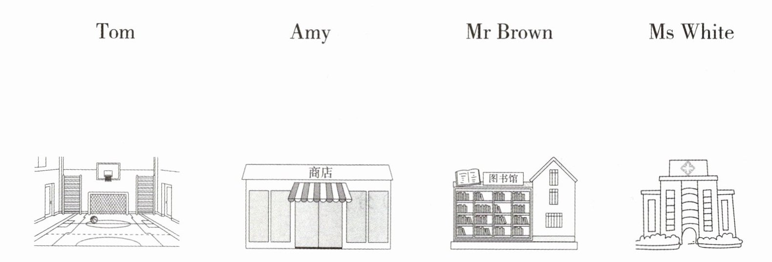 My name is Tim. I have four new friends in my community. That tall boy is Tom. His favourite place is the gym. He likes basketball. He often plays basketball there. This thin girl is Amy. Her favourite place is the library. She likes animal books. She often reads books there. That strong man is Mr Brown. He is a doctor. He works in a hospital in our community. This quiet woman is Ms White. She likes the shop. She can buy many nice gifts for her friends.