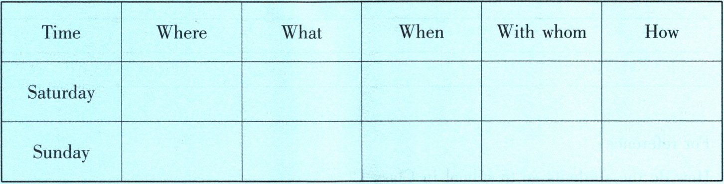任务说明:对自己的周末活动做出详细的计划,计划好打算去的地方、出发时间、想进行的活动、出行的交通方式以及和谁一起去,填写好计划表格,并讲述给父母或同学听。
