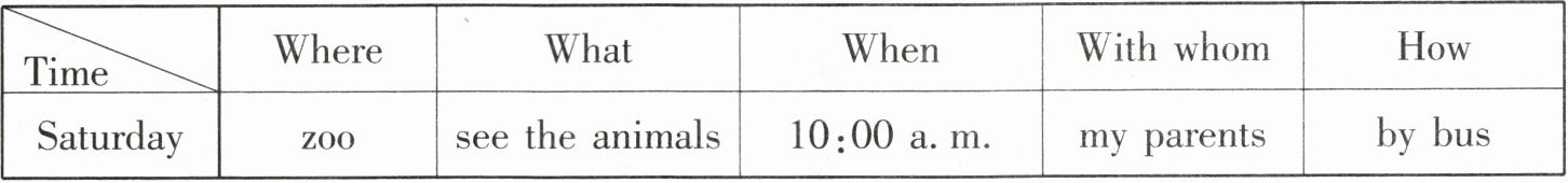 I'm going to have a happy weekend. On Saturday, I'm going to the zoo with my parents. I'm so happy because I can see the animals. We are going there by bus at 10:00 a. m.