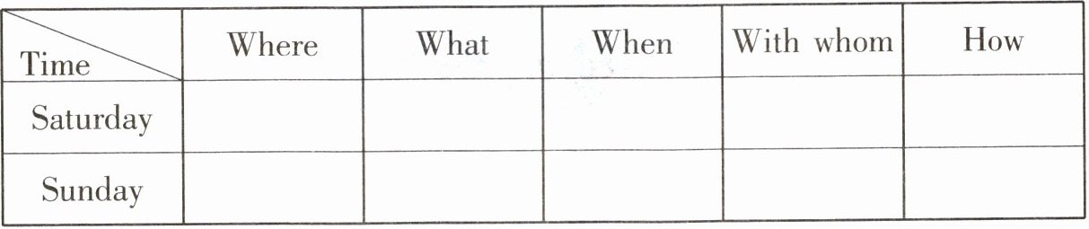 | Saturday | park | fly a kite | 9:30 a.m. | my friend Tom | by bike |