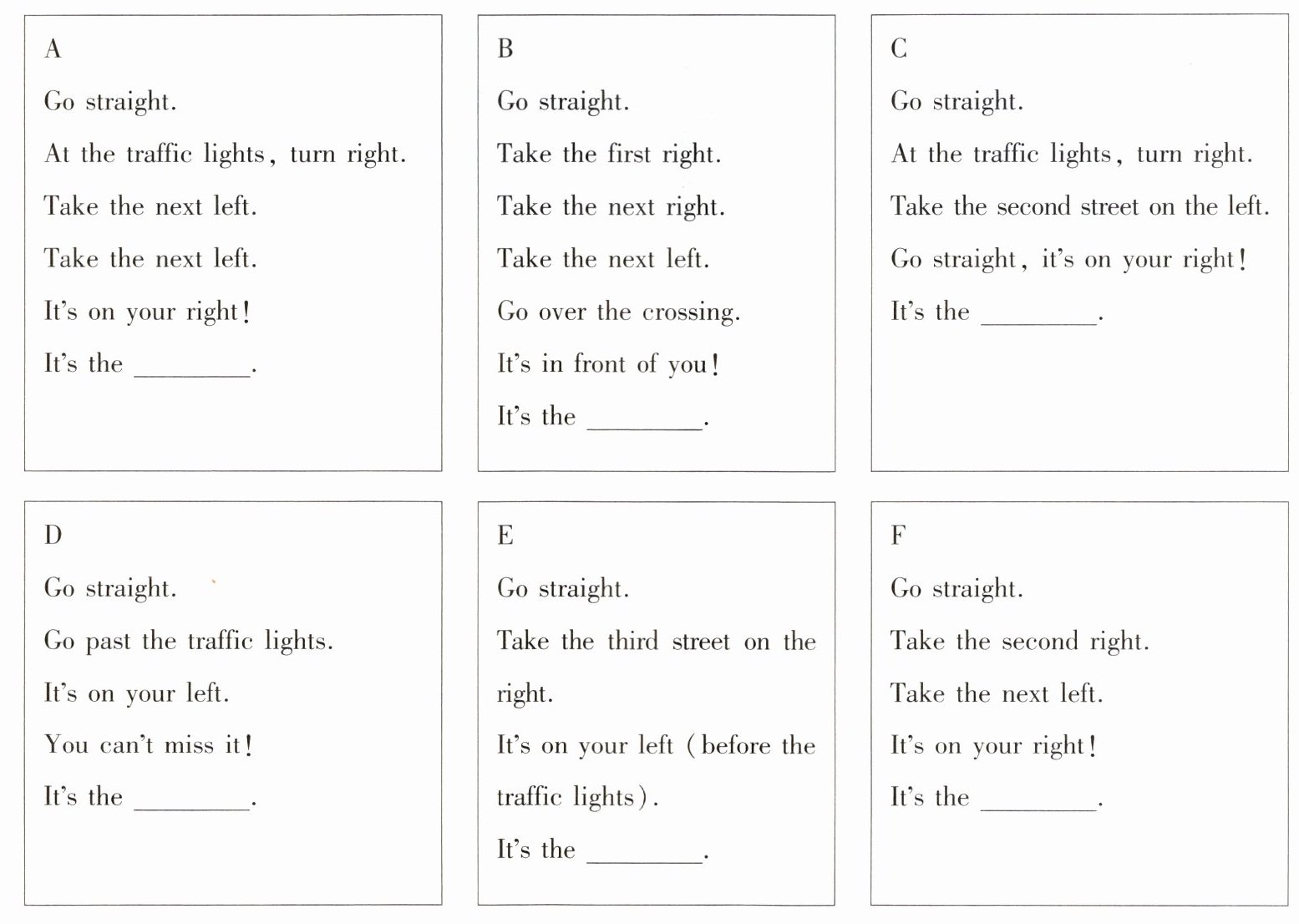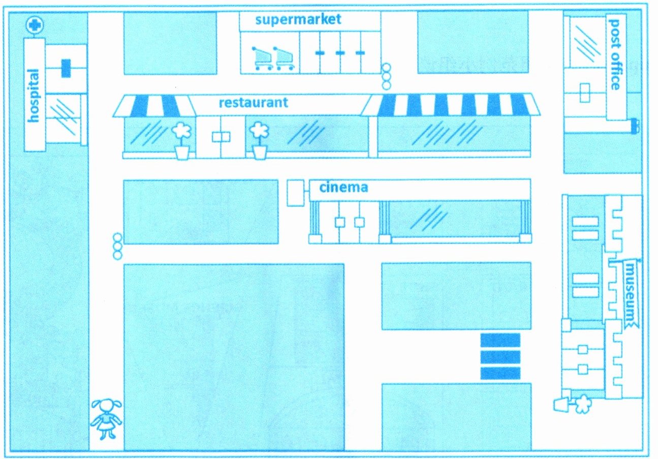 1. hospital 2. supermarket 3. restaurant 4. post office 5. cinema 6. museum