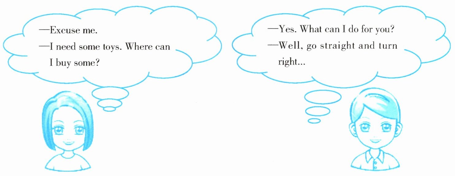 —Passer-by: Go straight and turn right at the restaurant. Then walk straight. The toy shop is on your left.