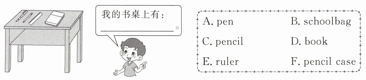 Ⅱ. 才才的书桌上放了哪些学习用品呢?看图,选出正确的选项写在横线上。