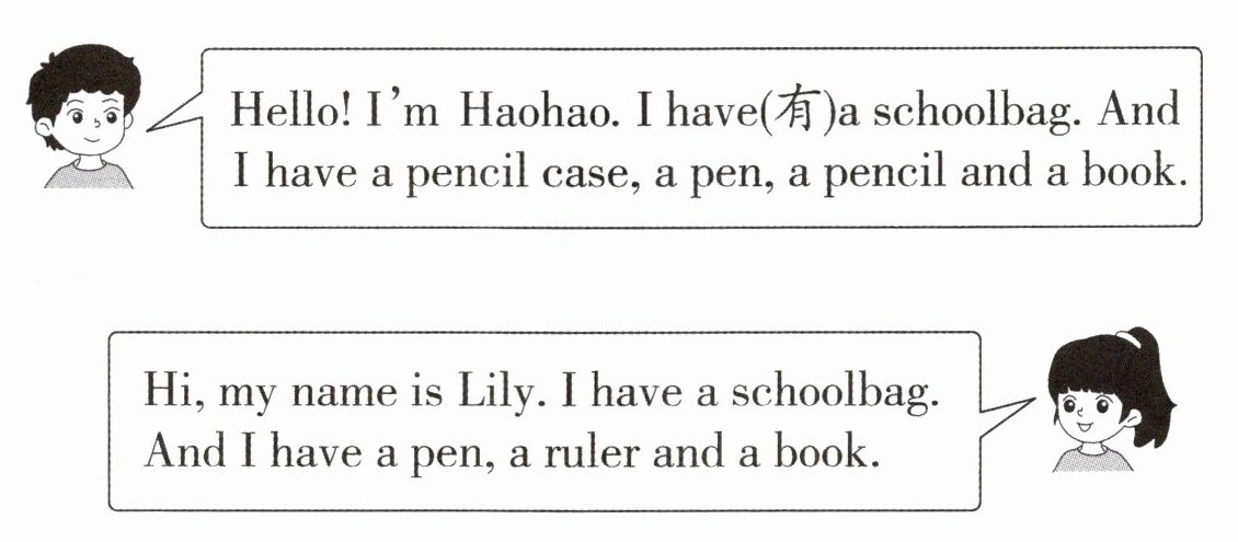 (一)1.√ 解析:根据Haohao说的“And I have a pencil case, a pen, a pencil and a book.”可知,Haohao有一个铅笔盒、一支钢笔、一支铅笔和一本书,题干表述正确。2. × 解析:根据Haohao说的“And I have a pencil case, a pen, a pencil and a book.”可知,Haohao有一个铅笔盒、一支钢笔、一支铅笔和一本书,没有尺子,题干表述错误。3. × 解析:根据Lily说的“And I have a pen, a ruler and a book.”可知,Lily有一支钢笔、一把尺子和一本书,没有铅笔,题干表述错误。(二)4. Lily 5. Haohao