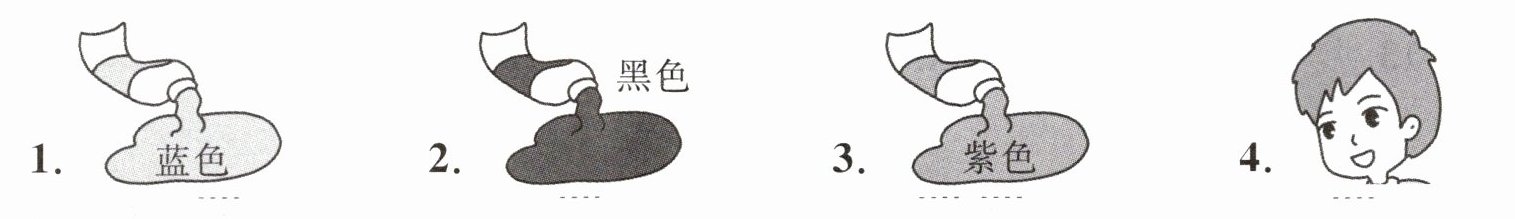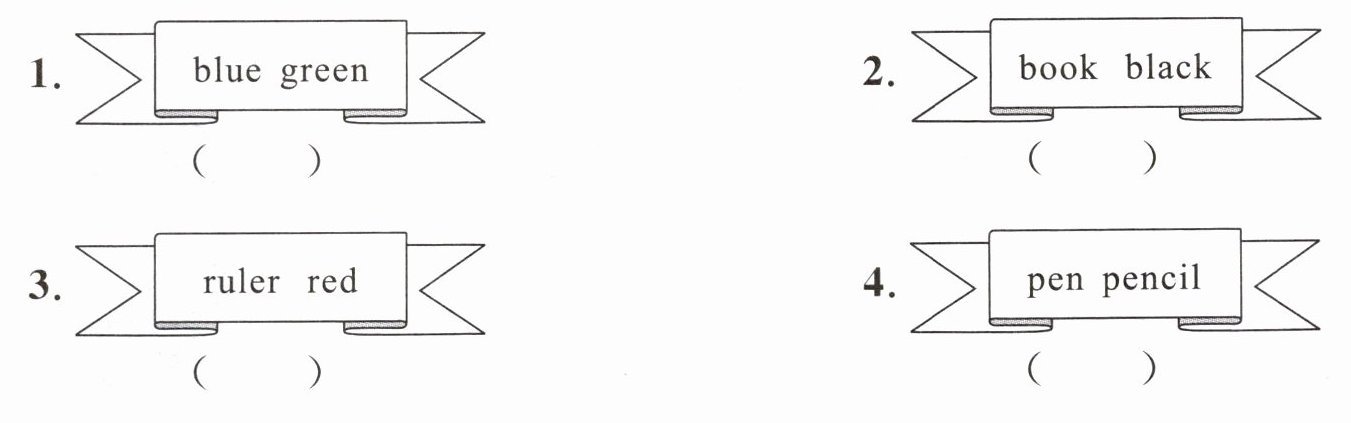 1. √ 解析:blue和green为颜色,属同类,故填√。2. × 解析:book为学习用品,black为颜色,不同类,故填×。3. × 解析:ruler为学习用品,red为颜色,不同类,故填×。4. √ 解析:pen和pencil为学习用品,属同类,故填√。