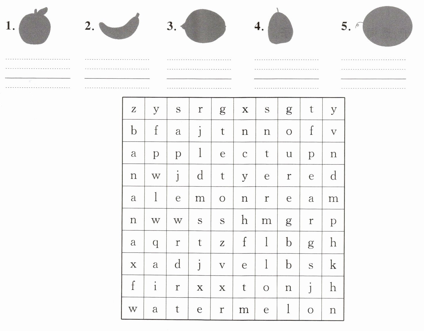 1. apple 2. banana 3. lemon 4. pear 5. watermelon