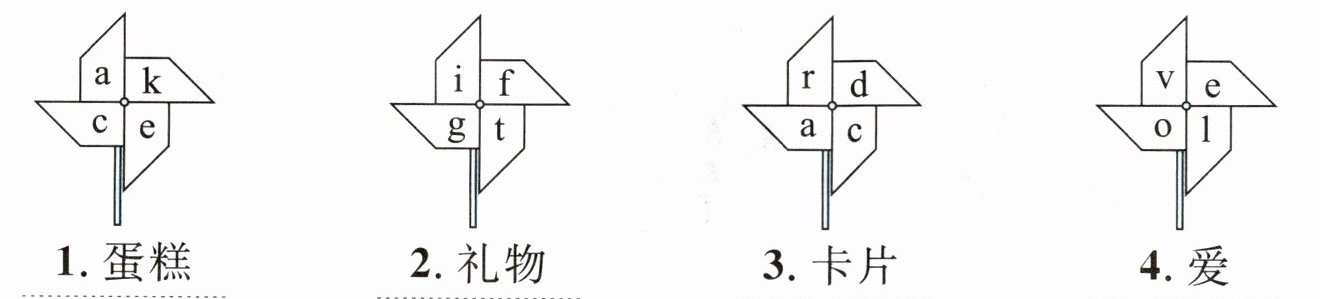 Ⅱ. 根据汉语意思,将风车按顺时针方向转动,并将所得的正确单词写在四线三格中。