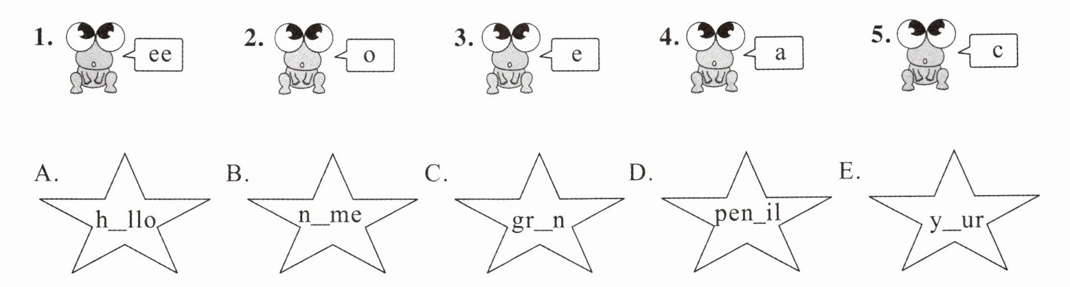 1.DF 2.A 3.CE 4.B 1.√ 解析:green意为“绿色的”,根据常识可知,西瓜外皮是绿色的,故填√。2.× 解析:blue意为“蓝色的”,根据常识可知,香蕉是黄色的,故填×。3.√ 解析:red意为“红色的”,根据常识可知,西瓜果肉是红色的,故填√。4.× 解析:yellow意为“黄色的”,根据常识可知,葡萄是紫色或绿色的,故填×。5.× 解析:black意为“黑色的”,根据常识可知,苹果是红色或绿色的,故填×。
