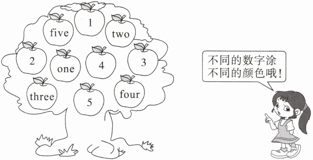 涂相同颜色的苹果分别为:1—one 2—two 3—three 4—four 5—five