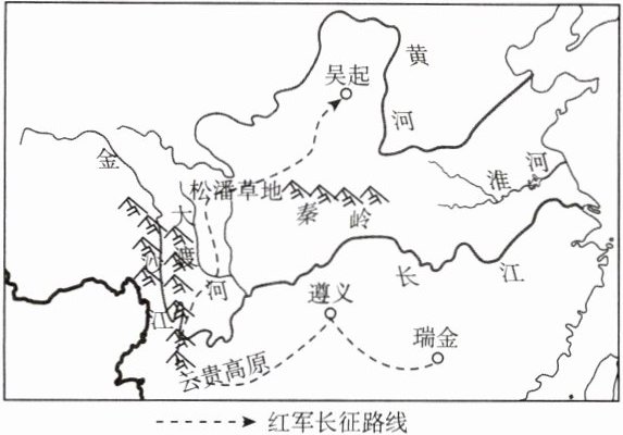 “红军不怕远征难,万水千山只等闲……”毛泽东的《七律·长征》带领我们共同回顾长征历程,铭记长征精神。读从江西瑞金到陕西吴起镇的长征路线示意图,完成 7~8 题。