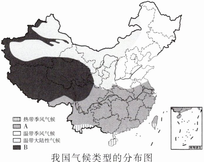 (1)A是亚热带季风气候;B是高原山地气候。 (2)我国位于世界上最大的大陆——亚欧大陆的东部,东临世界上最大的大洋——太平洋,海陆热力性质差异很大。 (3)多 北 (4)如甘肃的房屋建筑屋顶很平,浙江的房屋建筑屋顶坡度很大。原因:甘肃位于内陆地区,降水较少,房屋平顶易于晾晒农作物;浙江位于沿海地区,降水丰富,屋顶坡度大利于排水。 (5)受气候的影响,农业生产南方地区种植水稻,北方地区种植小麦。生活方面北方地区传统民居坐北朝南,墙体厚,窗户小,屋顶坡度小;南方地区墙体薄,窗户大,屋顶坡度大。
