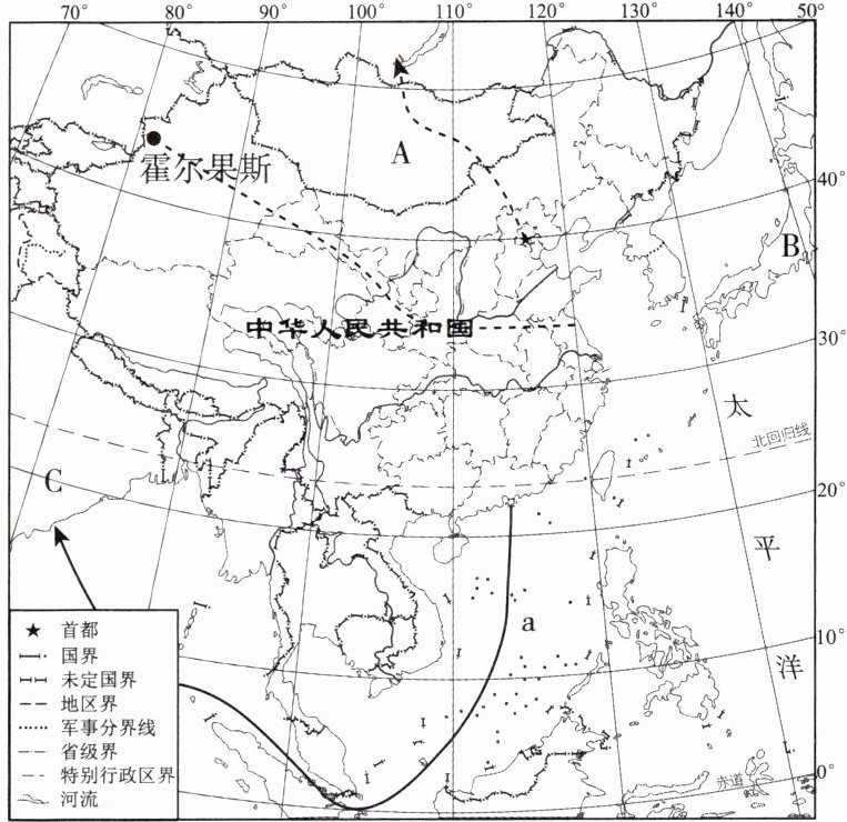 (4)我国出口物资通过海洋运输所经海域a是______,到达我国的邻国C______。