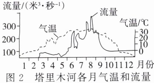 (3)读图 2 可知,该河在____月份时出现断流现象;最大的年径流量出现在____月份,影响塔里木河流量的最主要气候因素是____。
