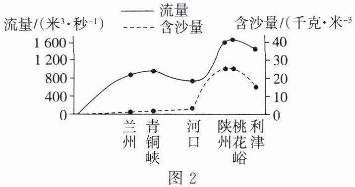 黄河哺育了灿烂的中华文明。多年来,黄河流域始终坚持生态优先、绿色发展,生态环境持续变好。读黄河流域示意图(图 1)和黄河流量、含沙量变化图(图 2),完成 6~8 题。