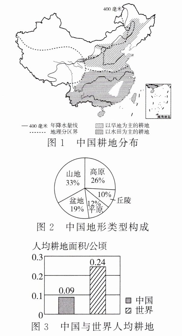 (1)我国耕地分布不均匀,大多数耕地分布在______毫米年降水量线以东的地区,其中水田和旱地的集中分布区以______(填山脉)—淮河一线为界。