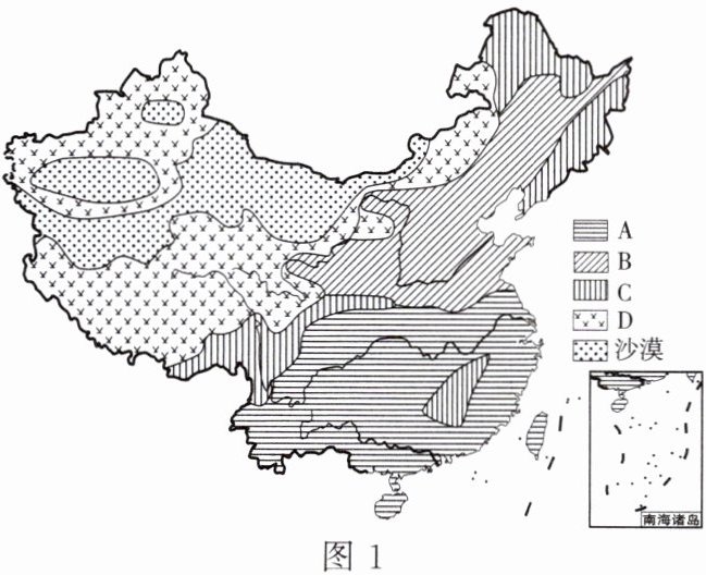 (5)图 1 中的 A、B 都表示耕地,主要集中分布在东部______(填“季风区”或“非季风区”)。