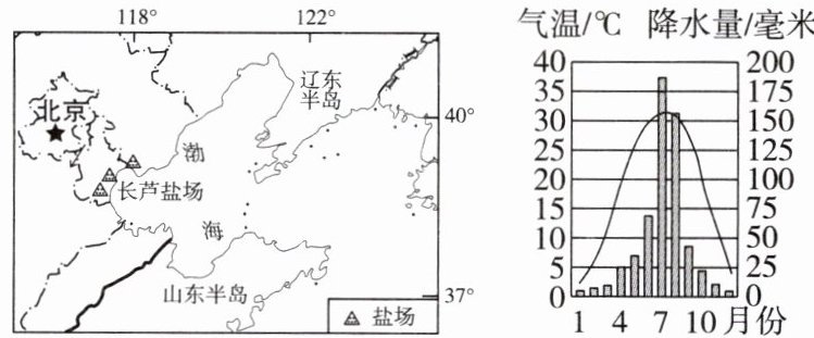 盐光互补是实现水上太阳能发电、水面蒸发制盐、水下水产养殖的产业发展模式。下图示意长芦盐场位置及气候资料。读图,完成4~5题。