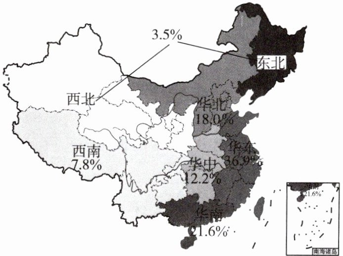 2023 年我国新能源汽车交出亮眼成绩单,产销量连续 9 年保持全球第一,新能源汽车作为我国战略性新兴产业正引领经济社会全局和长远发展,充分体现新质生产力特性。下图为我国新能源汽车用户分布图。据此完成 7~8 题。