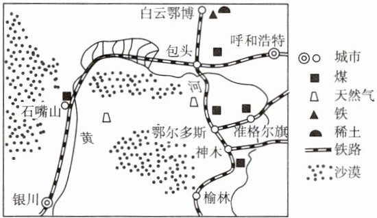 在西部大开发“十二五”规划中,呼包银榆经济区被列入西部重点开发地区。读呼包银榆地区示意图,完成 1~2 题。