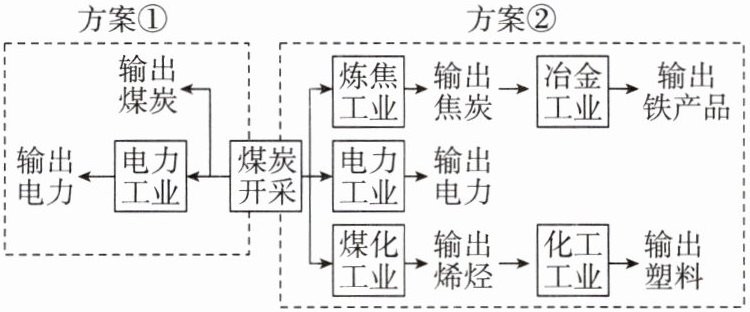(3)方案②。理由:利于提高资源利用率;利于把资源优势转化为经济效益;利于可持续发展;利于升级产业结构;利于产业转型发展;利于提升产业质量,带动相关产业发展。