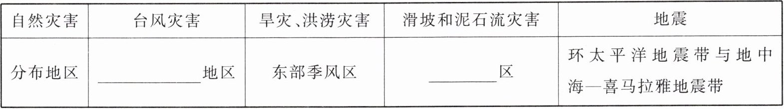 |分布地区|______地区|东部季风区|______区|环太平洋地震带与地中海—喜马拉雅地震带|