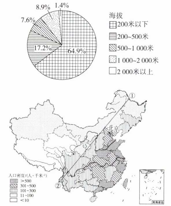 (2)从地形类型上看,我国约65%的人口主要分布在______(填地形类型)地区。(1分)