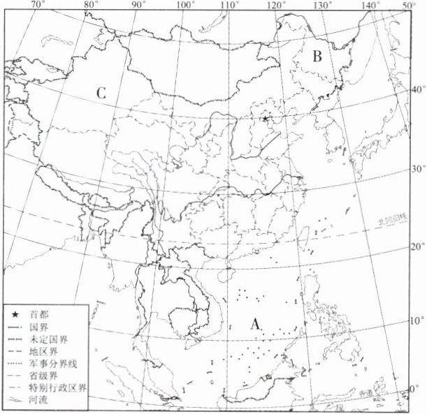 (8)C省级行政区的名称是______,简称是______。(2分)