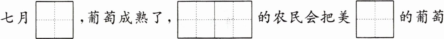 七月$\begin{array}{|c|c|}\hline & fèn \\ \hline & \\ \hline\end{array}\\ \hline & \\ \hline $,葡萄成熟了,$\begin{array}{|c|c|}\hline hào & kè \\ \hline & \\ \hline\end{array}\\ \hline & \\ \hline 的农民会把美\begin{array}{|c|c|}\hline & wèi \\ \hline & \\ \hline\end{array}\\ \hline & \\ \hline $的葡萄摘下来,运送到$\begin{array}{|c|c|c|}\hline & chéng & shì \\ \hline & & \\ \hline\end{array}\\ \hline & & \\ \hline $。