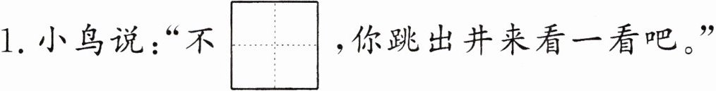 1. 小鸟说:“不$\overset{\mathrm{x}ì\mathrm{n}}{\begin{array}{l}\begin{array}{|c|c|}\hline & \\ \hline & \\ \hline\end{array}{\begin{array}{l}\begin{array}{|c|c|}\hline & \\ \hline & \\ \hline \end{array}{\begin{array}{l}\begin{array}{|c|c|}\hline & \\ \hline & \\ \hline }$,你跳出井来看一看吧。”