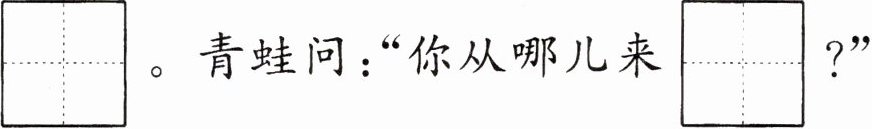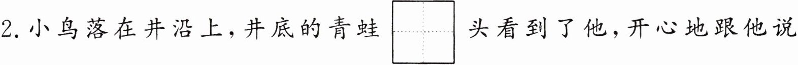 2. 小鸟落在井沿上,井底的青蛙$\overset{\mathrm{t}á\mathrm{i}}{\begin{array}{l}\begin{array}{|c|c|}\hline & \\ \hline & \\ \hline\end{array}{\begin{array}{l}\begin{array}{|c|c|}\hline & \\ \hline & \\ \hline \end{array}{\begin{array}{l}\begin{array}{|c|c|}\hline & \\ \hline & \\ \hline }$头看到了他,开心地跟他说$\overset{\mathrm{h}\mathrm{u}à}{\begin{array}{l}\begin{array}{|c|c|}\hline & \\ \hline & \\ \hline\end{array}{\begin{array}{l}\begin{array}{|c|c|}\hline & \\ \hline & \\ \hline \end{array}{\begin{array}{l}\begin{array}{|c|c|}\hline & \\ \hline & \\ \hline }$。青蛙问:“你从哪儿来$\overset{\mathrm{y}\mathrm{a}}{\begin{array}{l}\begin{array}{|c|c|}\hline & \\ \hline & \\ \hline\end{array}{\begin{array}{l}\begin{array}{|c|c|}\hline & \\ \hline & \\ \hline \end{array}{\begin{array}{l}\begin{array}{|c|c|}\hline & \\ \hline & \\ \hline }$?”