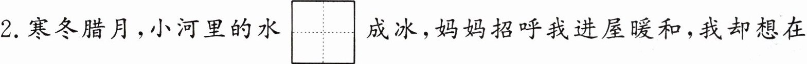 2. 寒冬腊月,小河里的水dòng成冰,妈妈招呼我进屋暖和,我却想在外面玩一会儿。