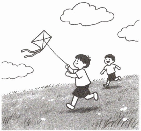 写话:星期天,天气晴朗。两个小朋友在草地上放风筝。他们一个在前边跑,一个在后面举着风筝,玩得特别开心。