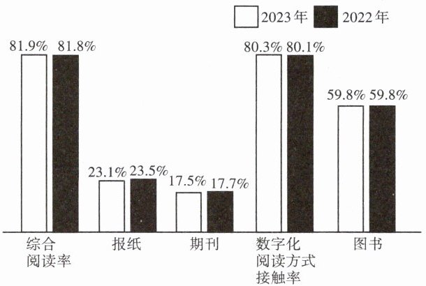 (2)【我分析】与2022年相比,2023年学生综合阅读率和数字化阅读方式接触率有所上升,报纸、期刊阅读率略有下降,图书阅读率基本保持不变。