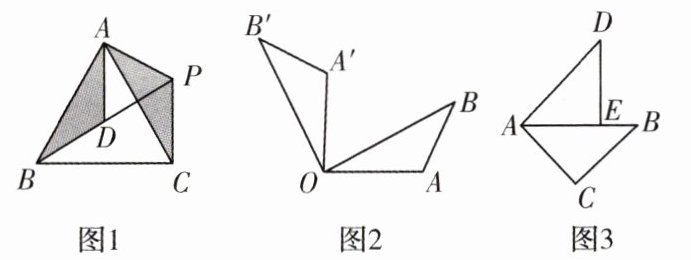 例 1 如图 1,$\triangle ABC$ 为等边三角形,$D$ 为 $\triangle ABC$ 内一点,$\triangle ABD$ 经过旋转后到达 $\triangle ACP$ 的位置,则:(1)旋转中心是