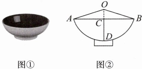 3.(2023 陕西中考)陕西饮食文化源远流长,“老碗面”是陕西地方特色美食之一。图②是从正面看到的一个“老碗”(图①)的形状示意图。$\overset{\frown}{AB}是\odot O$的一部分,$D是\overset{\frown}{AB}$的中点,连接$OD$,与弦$AB交于点C$,连接$OA$,$OB$。已知$AB = 24$cm,碗深$CD = 8$cm,则$\odot O的半径OA$为(