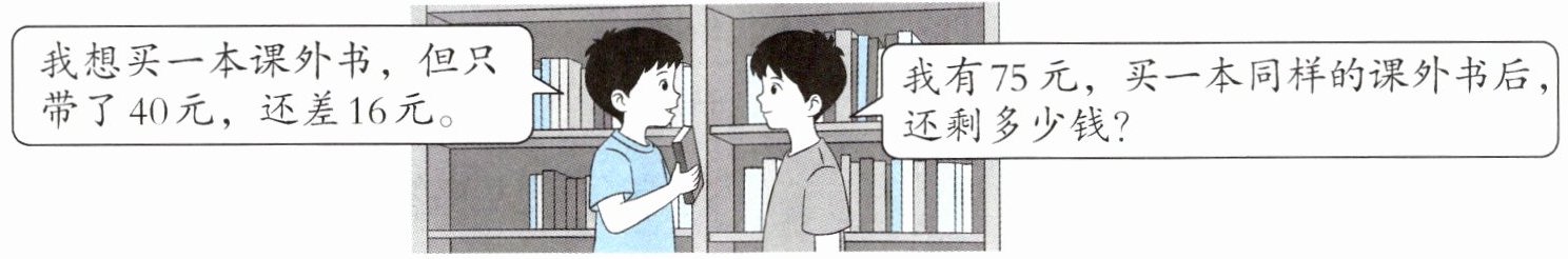 已知一个同学带了$40$元,买这本书还差$16$元,根据加法的意义,课外书价格为$40 + 16=56$(元)。
