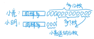 5. 小亮比小明多12枚纪念币。小亮送小明3枚纪念币后,小亮还比小明多几枚纪念币?(先画一画,再算一算)