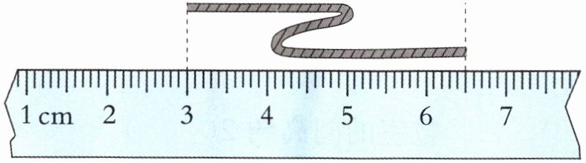 我的思考:绳子左端对齐3cm刻度,右端对齐6.5cm刻度,水平部分长度为6.5cm - 3cm = 3.5cm;弯曲部分有2处明显弯曲,每处弯曲长度约1cm,弯曲部分总长度约2×1cm = 2cm;绳子总长度约3.5cm + 2cm = 5.5cm,即5厘米5毫米。