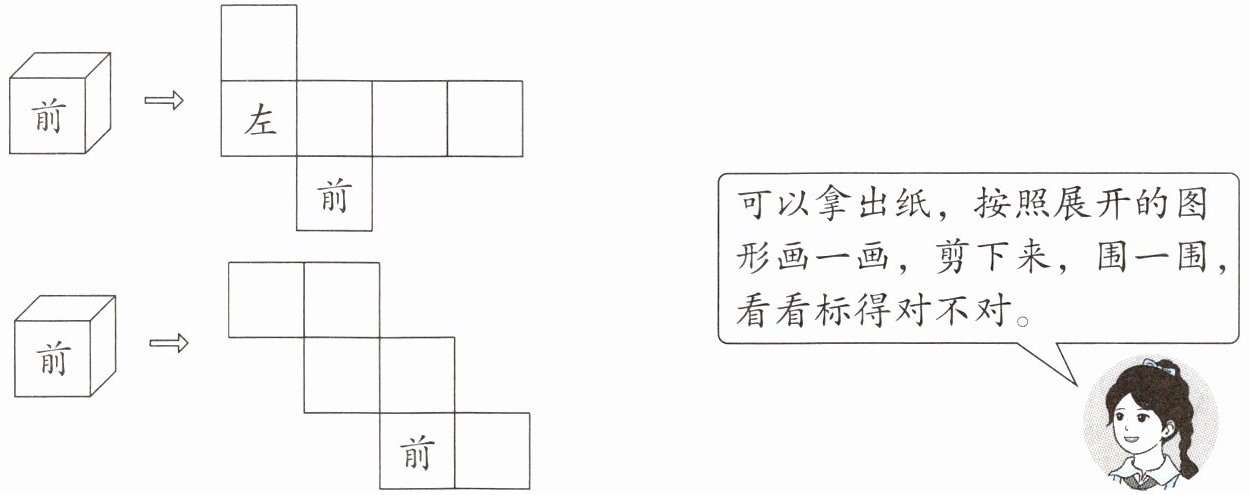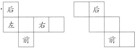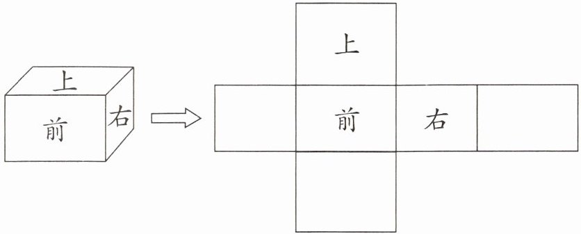 2. 把长方体纸盒沿着边剪开,得到它展开的图形,请根据图中确定的面,标出相对的面。