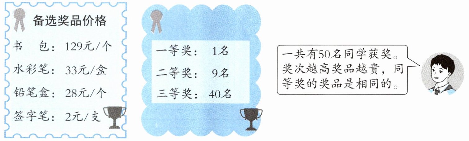 6. 学校组织知识问答活动,设计了三种奖次,需要给获奖的同学颁发奖品。请你从备选奖品中选择三种商品作为此次活动的奖品,要求购买奖品的总价接近但不超过500元。