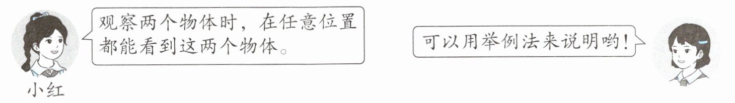 2.小红说得不对。在某些位置,当两个物体中的一个完全被另一个遮挡时,就看不到被遮挡的物体。例如:下面的两个物体,从右面观察,就看不到圆柱。