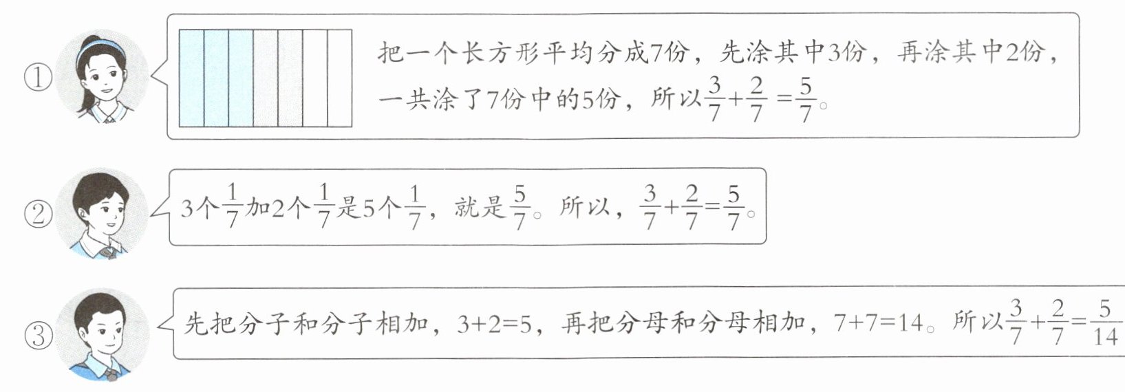 ②3个$\frac{1}{7}$加2个$\frac{1}{7}$是5个$\frac{1}{7}$,就是$\frac{5}{7}$。所以,$\frac{3}{7}+\frac{2}{7}=\frac{5}{7}$。