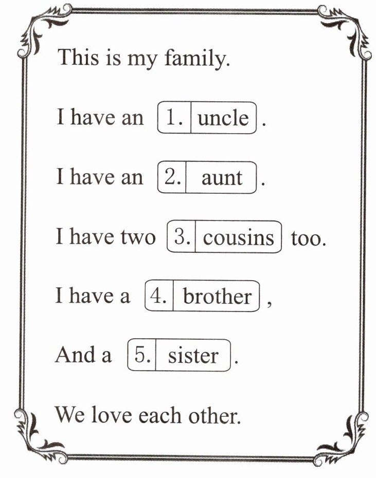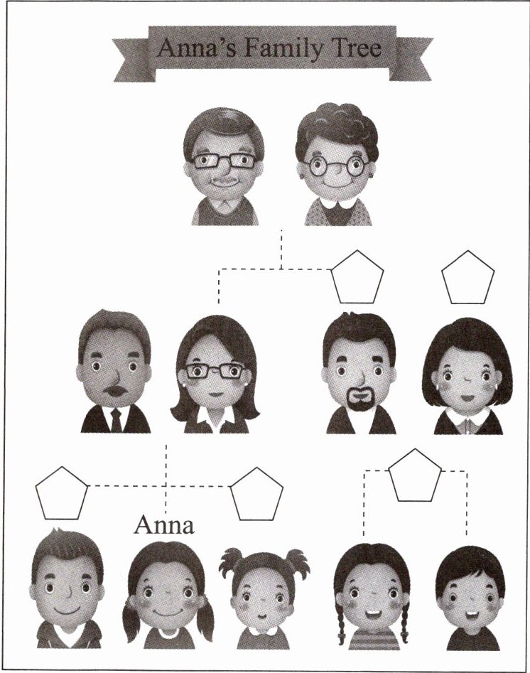 阅读 Anna 写的小诗,将单词前的序号填写在家谱图中相应的图框内。