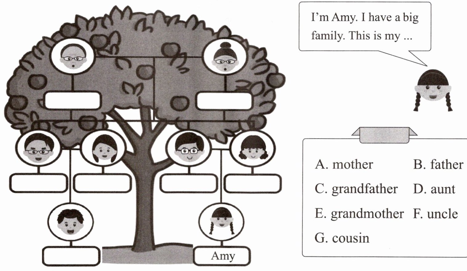 这是 Amy 的家谱图,读单词,将序号填写在对应的图框内,然后以 Amy 的角色介绍一下家庭情况吧!