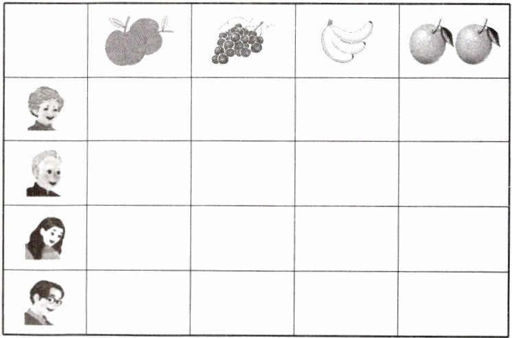 (注:因原始表格未提供人物标识,此处按对话顺序对应四行人物,水果列从左到右依次为苹果、葡萄、香蕉、橙子。)