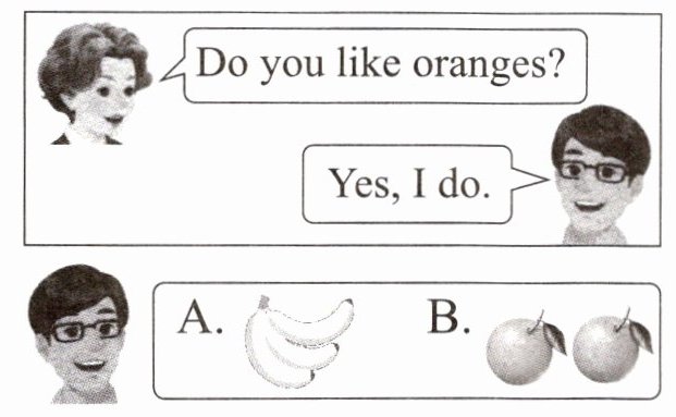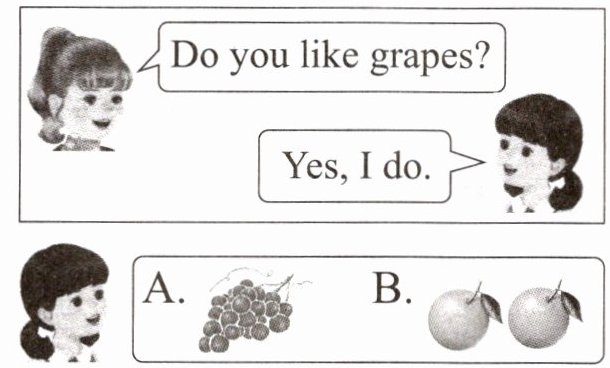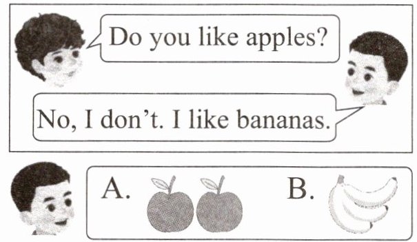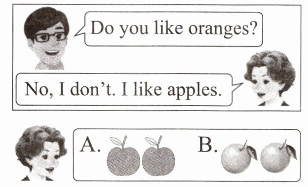 看图,阅读对话,完成表格。人物喜欢的水果用“√”表示,不喜欢的用“×”表示。